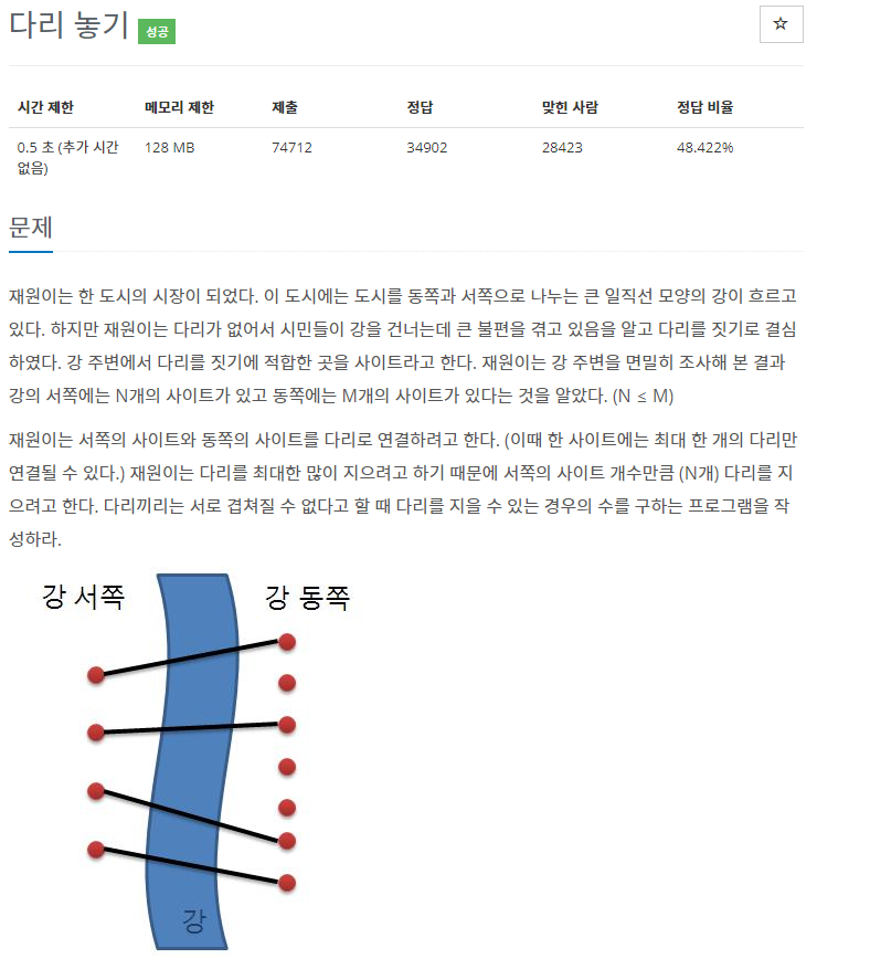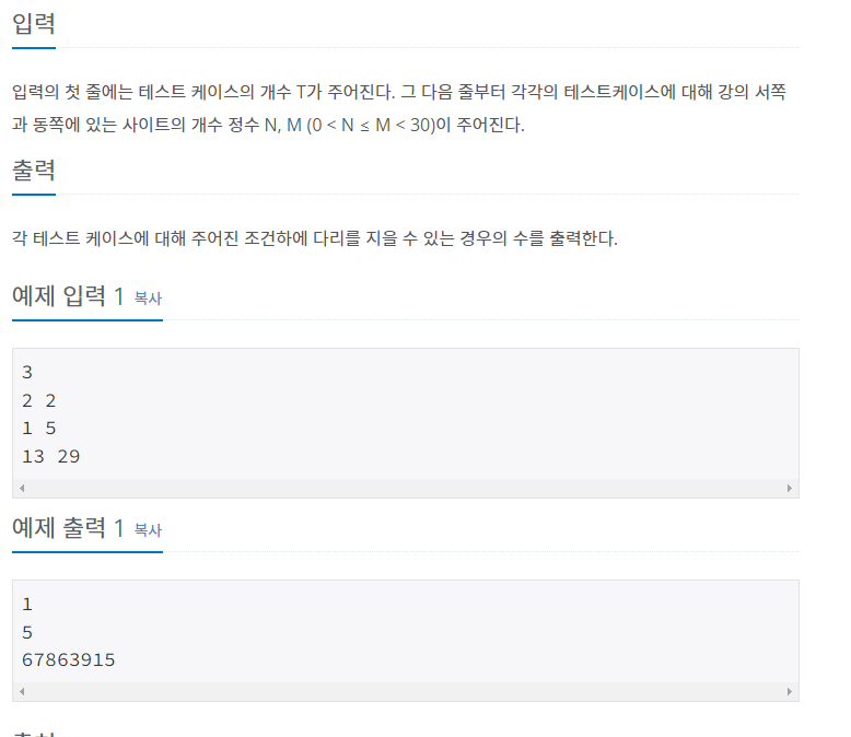 경우의 수를 계산하는 문제다. 이때 순서에 상관없이 N개의 다리와 M개의 다리를 이으면 되므로, 조합의 개념을 이용하면 쉽게 해결할 수 있다.