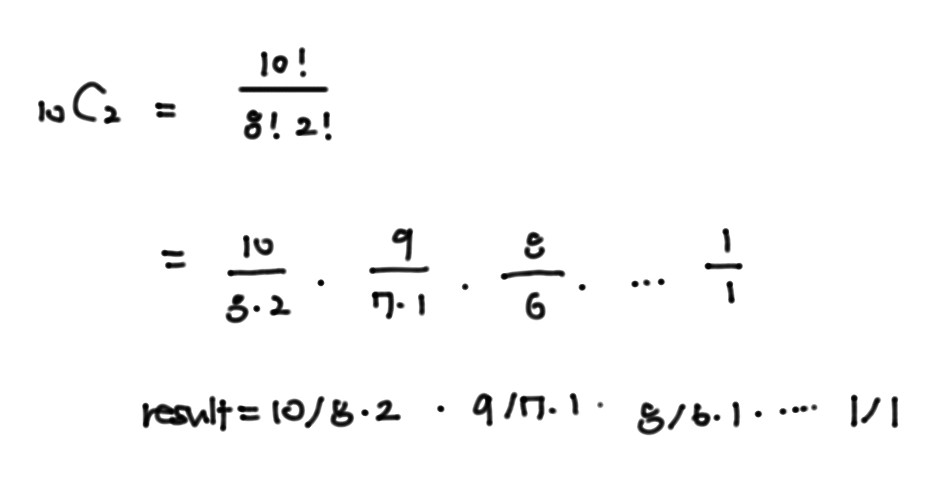 팩토리얼은 숫자가 너무 큰 경우가 많아 오버플로가 발생하기 십상이다 .따라서 분자와 분모를 따로 계산하고, result에 곱하거나 나누는 식으로 수의 범위를 줄여서 계산하였다. 예를 들어, 10C2의 경우에는 다음과 같은 과정으로 계산된다.