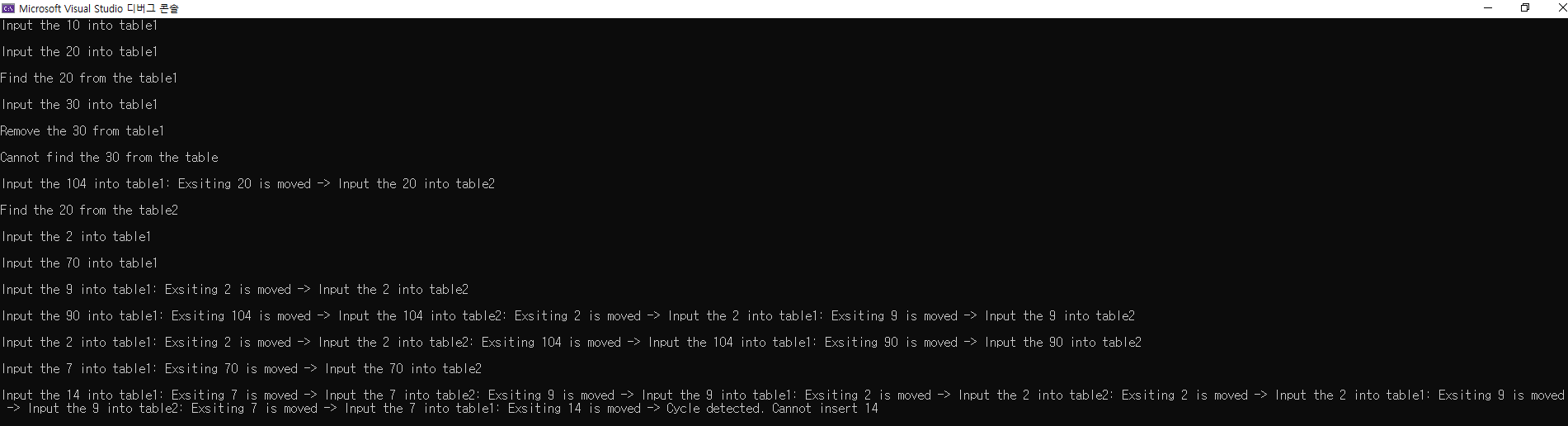 std::cout << key << " 삽입 시 사이클 발생! 재해싱이 필요합니다!" << std::endl;