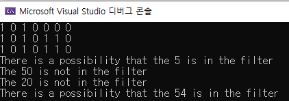 100, 54, 82를 차례대로 삽입하고, 5와 50, 20, 54를 찾으면 다음과 같은 결과가 나온다. 여기서 5를 삽입하지 않았음에도 있을 수 있다고 출력하는 이유를 앞선 원소 삽입 과정에서 5에 해당하는 비트들이 이미 1이 되었기 때문이다. 그림으로 보면 다음과 같다.