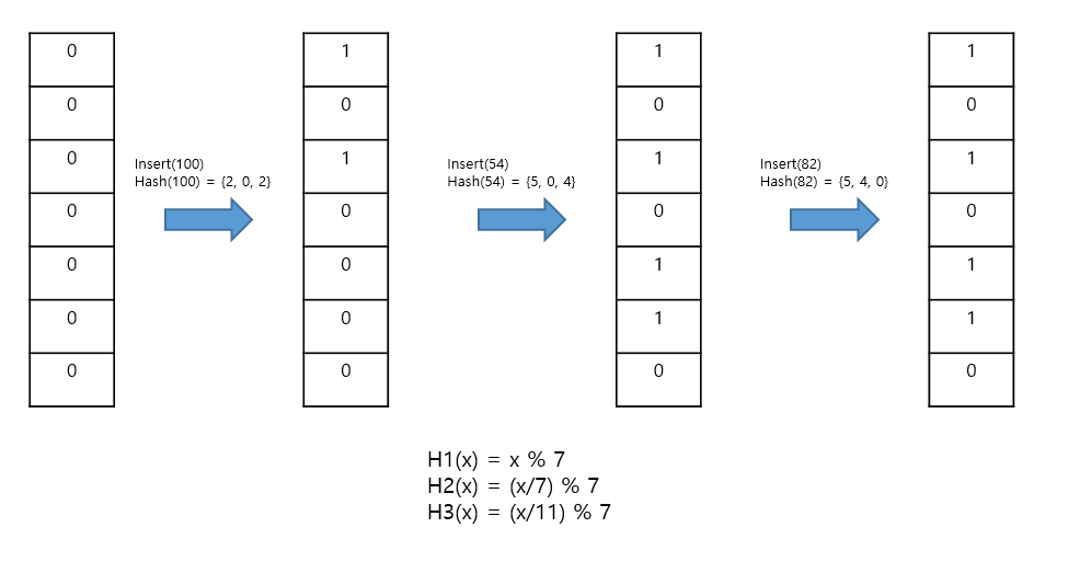 위 그림은 크기가 7이고, 3개의 독립적인 해시 함수로 구성된 블룸 필터에서 원소 삽입이 어떻게 작동하는지 설명하고 있다. 해당 필터를 기준으로 직접 컨테이너를 구현해 보도록 하겠다.