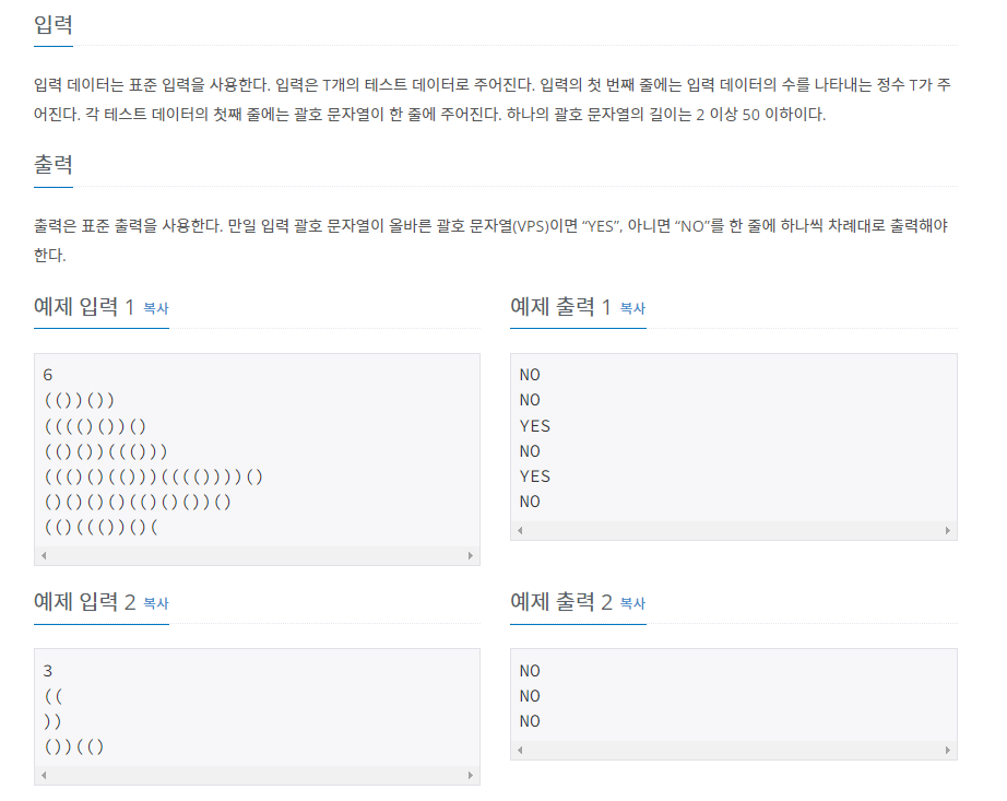괄호 검사는 스택을 활용하는 대표적인 문제다. 입력받는 문자가 소괄호이기 때문에 스택에서 하나씩 꺼내어 괄호 문자열이 맞는지 확인하면 된다.