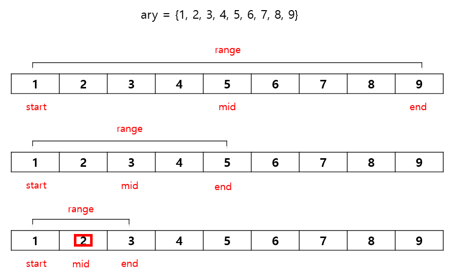 1부터 9까지 정수가 초기화된 배열 ary에 대해 2를 찾는 과정을 위의 이진 탐색 방법으로 찾아보자.