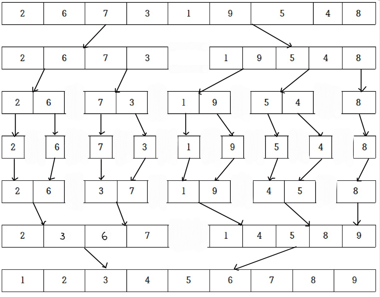 초기 배열 {2, 6, 7, 3, 1, 9, 5, 4, 8}이 각 부분 배열이 하나의 원소만을 포함할 때까지 분할된다. 이후, 배열을 다시 합치는 작업을 반복하되, 병합 과정에서 오름차순 순서가 유지되도록 배열의 원소를 조정한다.
