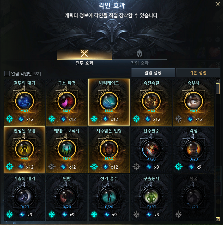 각인서는 Alt + i를 눌러 자신이 원정대에 공유하고 있는 각인 현황을 의미합니다.