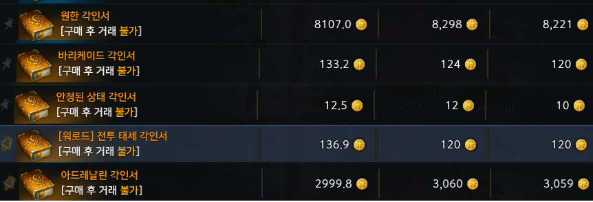 일반적으로 공용 각인서는 가격이 비쌀수록 다른 캐릭터를 육성할 때 사용하기 쉽습니다. 그리고 직업 각인 악세서리가 비싸므로 직각을 3레벨을 주려고 한다면 전설 각인서를 읽는 게 싸게 칩니다. 일단 3만 골드 내로 해결하고 싶으므로 "전투 태세" 각인서와 "안정된 상태" 혹은 "바리케이드" 각인서를 읽어야겠다고 생각합니다.