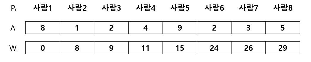 은행 창구에서 대기하고 있는 상황을 상상해보자. 이 은행에는 단 하나의 창구만이 있고, 대기열에는 총 8명의 고객이 차례를 기다리고 있다고 가정해 보자. 각 고객의 업무 처리 시간을 A라고 표현한다면, 고객별로 업무 처리 시간 A가 다르게 정해져 있다.