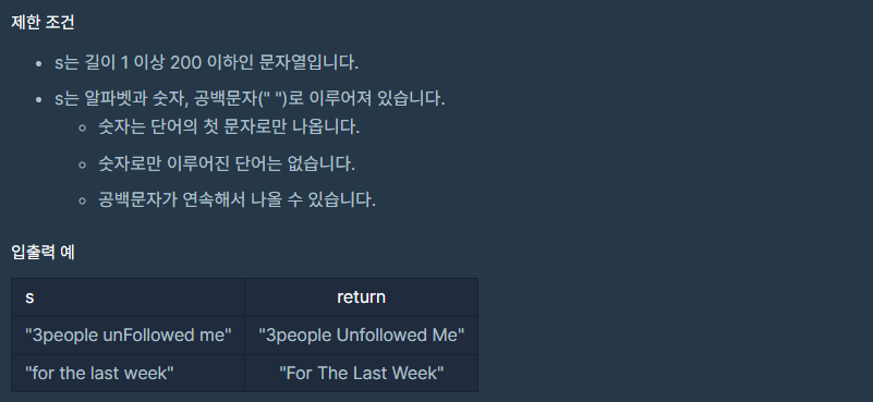 첫 문자를 대문자로 처리하고 나머지 알파벳을 소문자로 처리하는 문자열 처리 문제다. 입력 문자열에서 각 단어의 첫 문자를 대문자로, 그 외의 알파벳을 소문자로 바꾸는 작업이 필요하다. 여기서 '단어'는 공백 문자로 구분되므로, 문자열을 순회하며 공백 문자를 만났을 때 그 다음 문자를 대문자로 바꿔주면 된다.
