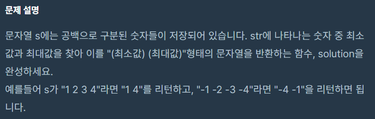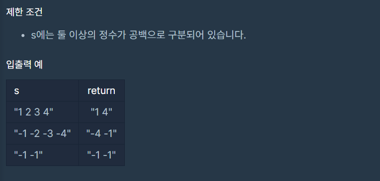공백으로 구분된 문자열에서 최솟값과 최댓값을 뽑아 출력하는 문제다. 공백을 만날 때마다 벡터에 문자열을 정수로 바꾼 후 값을 넣어주는 방식을 사용하면 된다.