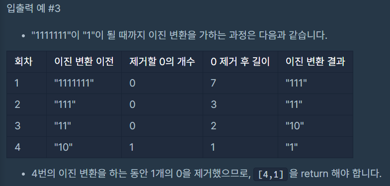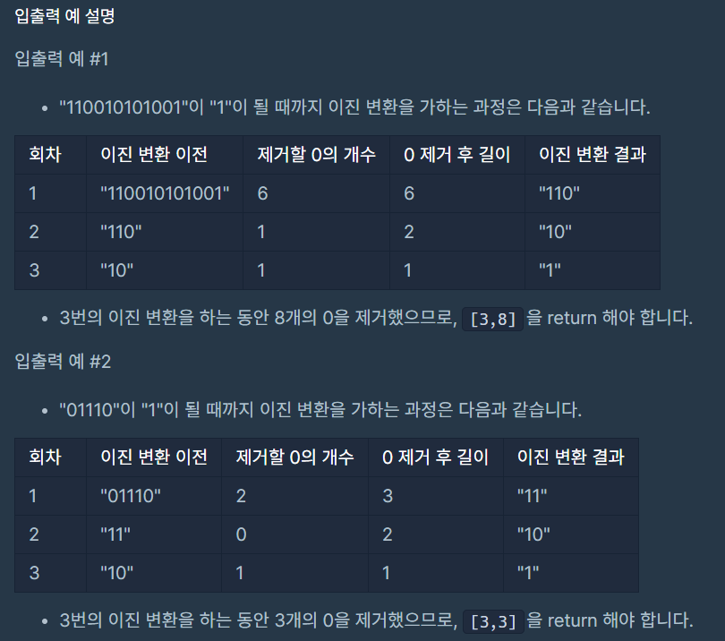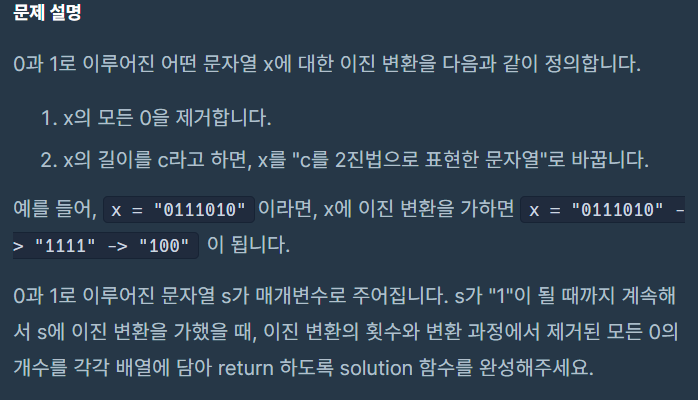 1과 0으로 구성된 문자열에서 특정 조건을 만족할 때까지 이진 변환 프로세스를 반복하는 문제다. 프로세스는 다음과 같다.