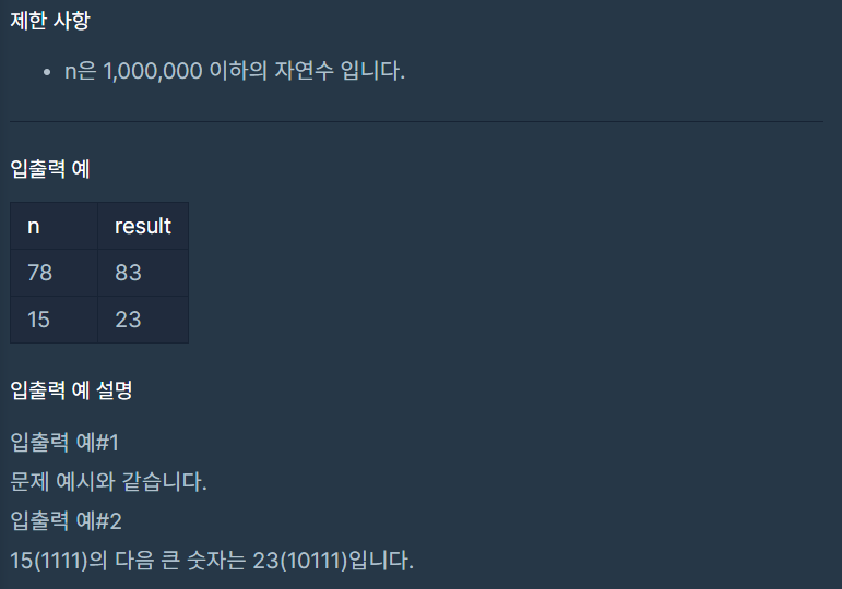 주어진 정수 n의 이진 표현에서 1의 개수가 같은 n보다 큰 정수 중 가장 작은 정수를 찾는 문제다. 이진 표현을 하기 위해 bitset 라이브러리를 이용하면 효율적으로 문제를 해결할 수 있다.