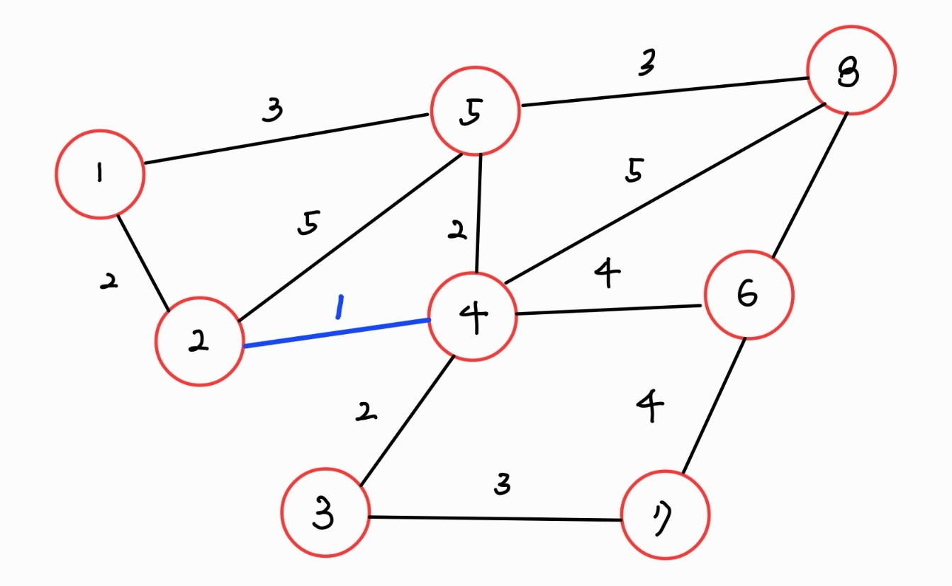 여기서 weight가 가장 작은 에지를 MST에 추가한다. 가중치가 가장 작은 것은 2와 4를 연결하는 에지이므로 (2,4) 에지가 선택되었고, DS에서는 union(2,4)가 수행된다.