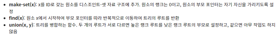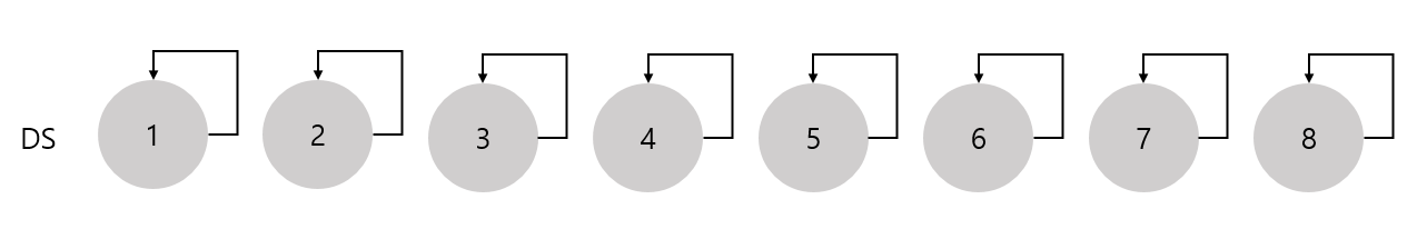 Disjoint-Set 자료 구조를 구현할 ds 클래스다. x를 ID로 갖는 원소를 새로운 집합으로 생성하는 make_set() 함수와, 원소 x가 속한 집합의 대표 원소를 찾는 find() 함수, 두 개의 원소 x와 가 속한 집합을 합치는 union_set() 함수를 구현해 놓았다.