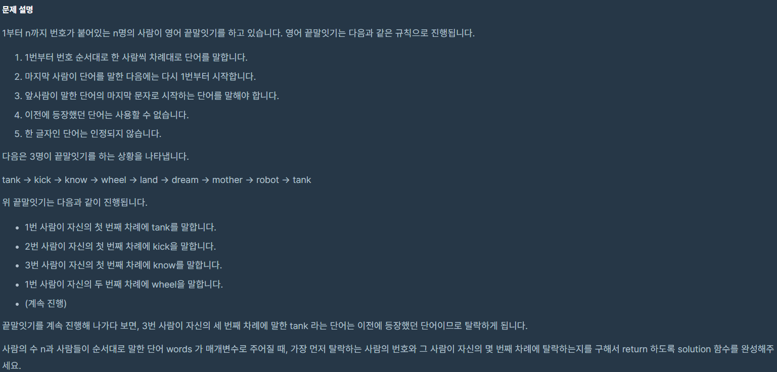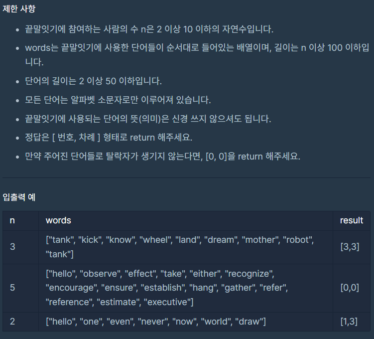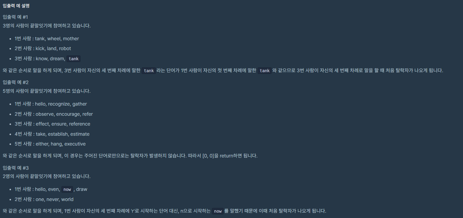 이 문제는 끝말잇기 게임의 참가자들 중에서 규칙을 어긴 첫 번째 참가자와 그 참가자의 턴을 식별하고 출력하는 것을 목표로 한다. 여기서 주요 과제는 두 가지다.