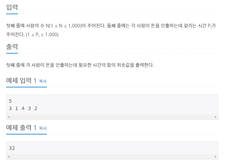 각 사람이 돈을 인출하는 데 필요한 시간 합의 최솟값을 출력하는 문제다. 대표적인 그리디 알고리즘으로 효율적으로 해결할 수 있는 문제로서, 실행 시간이 가장 짧은 프로세스부터 우선적으로 처리하는 최단 작업 우선 스케줄링 방식을 이용하면 된다. 여기서 돈을 인출하는데 걸리는 시간을 작업으로 보고, 이 작업들을 가장 짧은 것부터 처리하면 모든 사람이 돈을 인출하는데 필요한 최소 시간을 구할 수 있다.