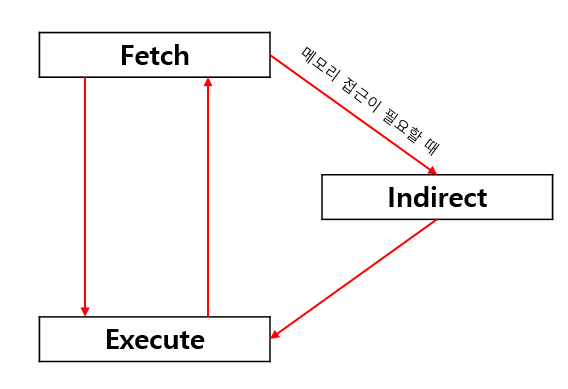 일부 명령어는 간접 사이클을 포함할 수 있다. 간접 사이클(Indirect cycle)은 주소를 포함하는 명령어가 메모리에서 해당 주소를 찾아 그 값을 다시 참조해야 하는 상황이다. 예를 들어, 어떤 명령어가 메모리 주소 A에 저장된 값을 읽어야 하는데, 메모리 주소 B에 저장된 값이 실제로 우리가 필요로 하는 데이터가 저장된 메모리 주소 A를 가리킨다면, 먼저 주소 B를 참조하여 실제 값이 저장된 주소 A를 얻어와야 한다. 이러한 추가적인 메모리 접근 단계가 간접 사이클이다.