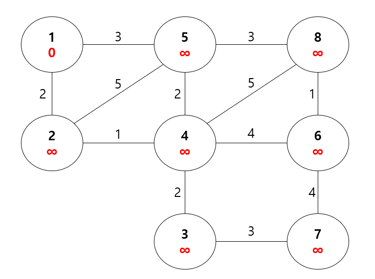 먼저 시작 정점을 제외하고, 모든 정점의 거리 값을 무한대로 초기화한다. 이는 그래프의 시작 정점을 제외하고 모든 정점들이 MST에 포함되지 않았음을 나타내기 위해서다. 이를 통해 최소 신장 트리에 아직 포함되지 않은 정점들은 다른 어떤 정점보다 거리가 멀다고 판단되어, 그 정점들이 먼저 선택되지 않도록 한다.