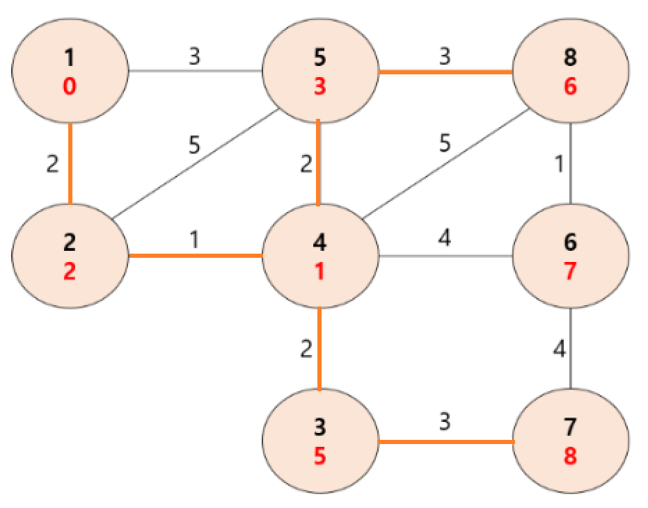 위와 같은 방법으로 모든 정점에 안착하면, 다음과 같이 최종 MST가 완성된다.