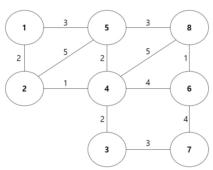 다음과 같은 그래프가 있다고 가정하고, 이러한 그래프에 프림 알고리즘을 적용하여 최소 신장 트리를 구하는 과정을 살펴보자.