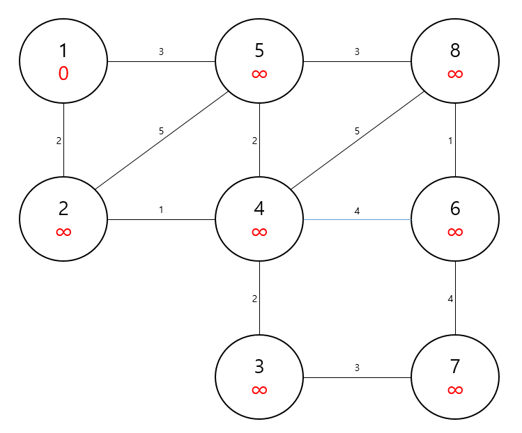 - 시작 노드의 거리 값은 0으로, 이를 제외한 모든 노드의 거리 값은 무한대로 초기화