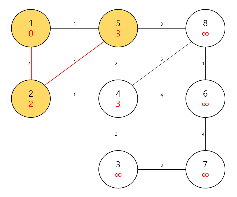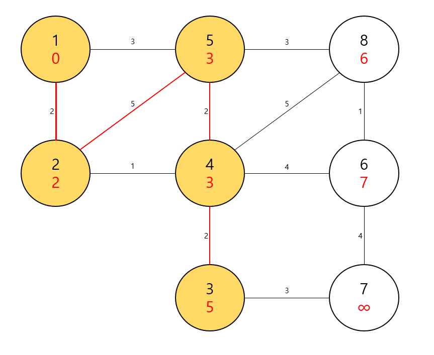 - 정점 2와 정점 5의 거리 값: 2 + 5 = 7, 하지만 이미 3인 최솟값이 있으므로 갱신하지 않음