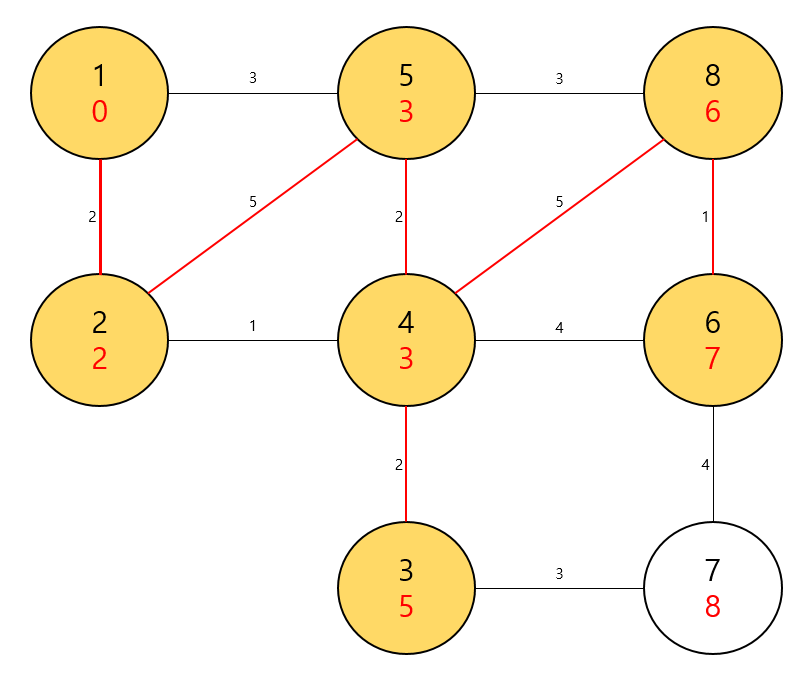 - 정점 5와 정점 8의 거리 값: 3 + 3 = 6