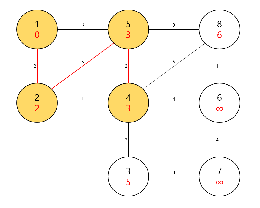 - 정점 4와 정점 3의 거리 값: 3 + 2 = 5