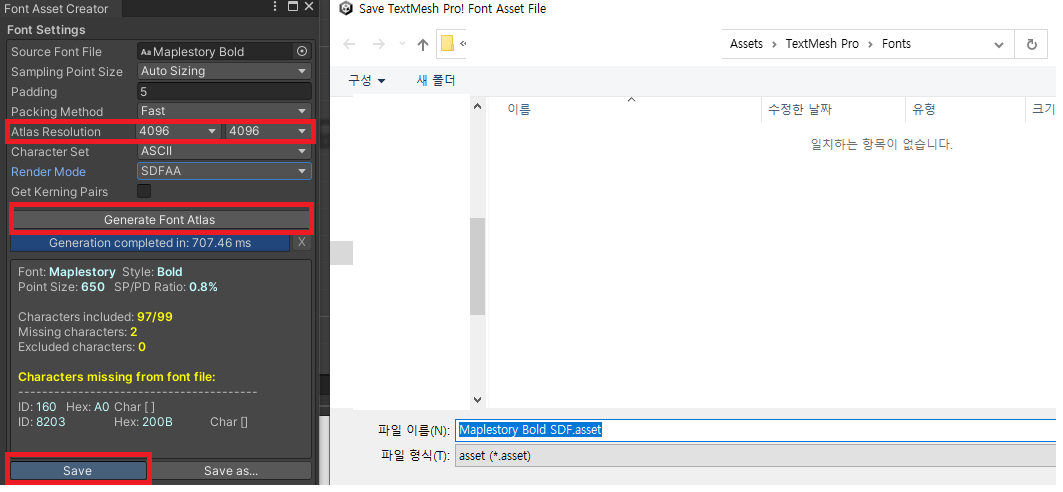 폰트 아틀라스를 생성하면 다음과 같은 화면이 뜰 건데, Save를 눌러서 TextMesh Pro → Fonts 폴더에 저장하자.