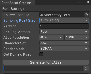 - Sampling Point Size: 폰트의 기본 크기 설정. 이 크기는 Atlas에 렌더링 되는 글자의 실제 픽셀 크기에 영향을 미치므로, 적절한 스케일링을 통해 메모리 사용량을 보존
