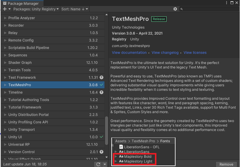 필자의 경우 넥슨의 메이플스토리 서체와 TextMesh Pro를 기준으로 진행하겠다. 해당 사이트의 TTF 파일을 다운로드하여 폰트 작업이 필요한 유니티 에셋에 옮긴다. 필자의 경우 Assets → TextMesh Pro → Fonts 폴더에 옮겼다. 만약 이 과정에서 TMP 폴더가 없으면, TMP Essentials을 패키지 매니저에서 임포트 해주자.