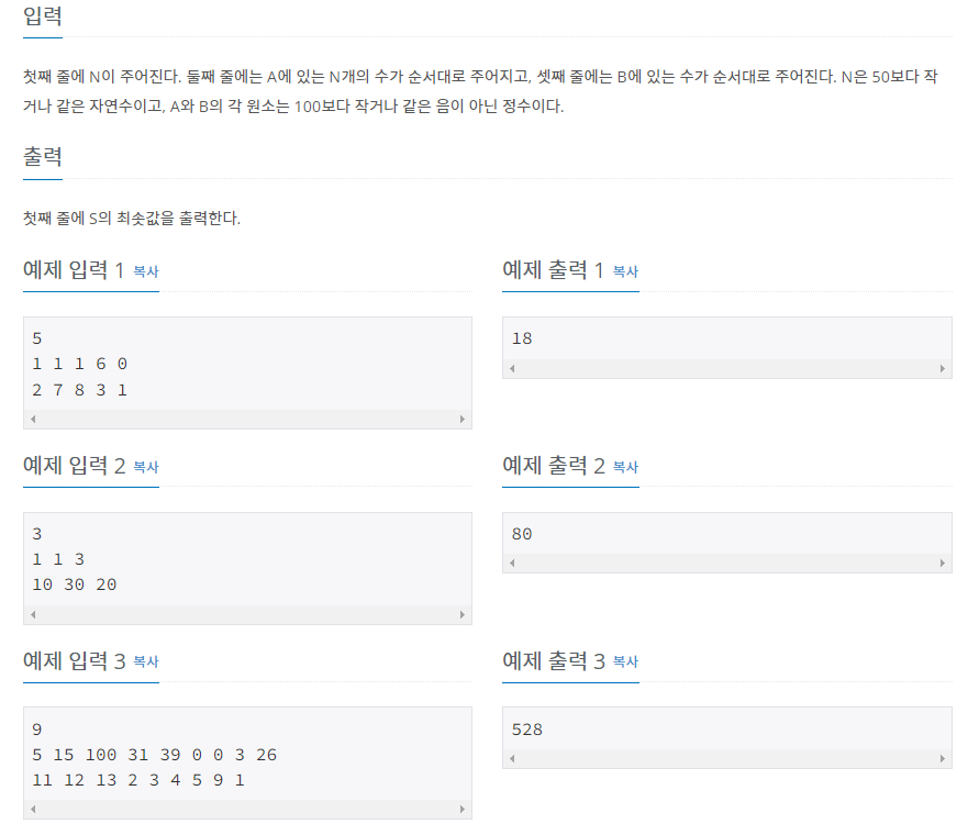 배열 A와 B를 받아, 두 배열의 곱의 합 A[i] * B[i]의 합의 최솟값을 구하는 문제다. 이는 A 배열의 최솟값과 B 배열의 최댓값을 곱하면 쉽게 해결할 수 있다. 이를 엄밀히 증명하면 다음과 같다.