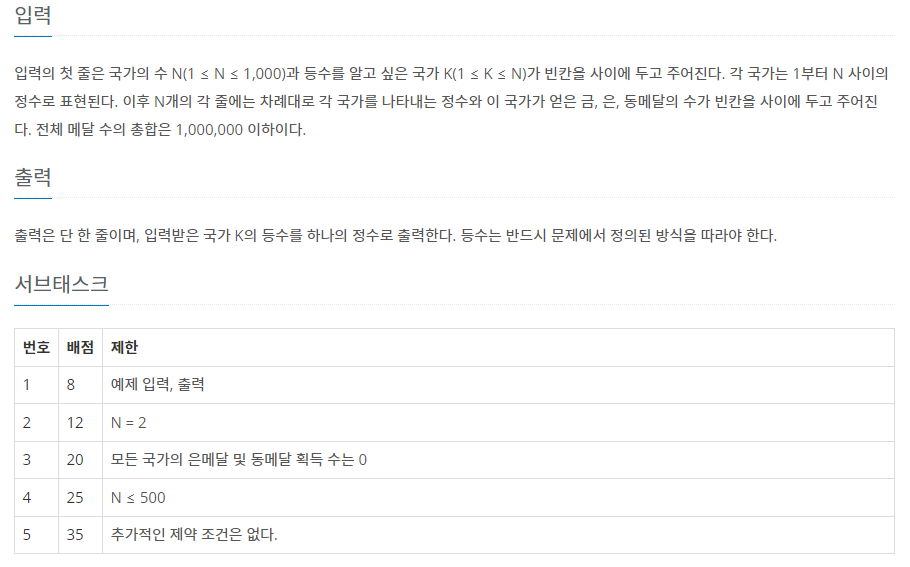 나라의 수 N과, 등수가 궁금한 나라의 이름 K를 입력받고, 각 나라 별 메달 획득 수를 초기화한다. 그후 내림차순으로 정렬해 주자.