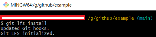 먼저 Git lfs 공식 홈페이지에서 해당 파일과, 명령어를 입력할 Git Bash를 다운로드한다. 그리고 파일을 실행시켜 Git LFS를 설치해 준다. 그후 옮길 파일이 있는 폴더를 Git Bash를 이용해 열어주고, 해당 명령어를 입력하여 lfs를 설치해준다. 필자의 경우 example이라는 리포지토리에 example.zip 파일을 옮길 예정이니 다음과 같은 화면일 것이다.