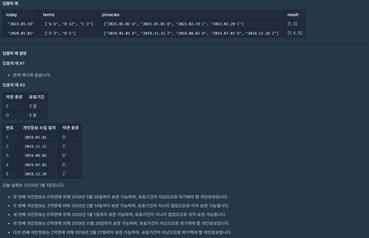 따라서 이 문제의 목표는 오늘 날짜를 기준으로 개인정보의 유효 기간이 지났는지를 판별하는 것이다. 유효 기간이 지난 개인정보의 경우 해당 정보의 인덱스를 결과 벡터에 추가하면 된다. 이 과정을 통해 문자열 처리 및 날짜 비교 기법을 활용하게 된다.