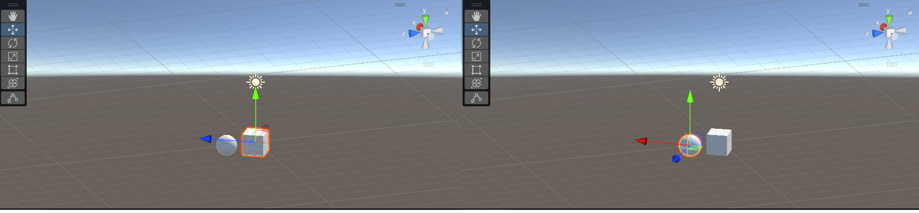 구는 월드에서 제시하는 축과 전혀 다른 방향으로 움직였지만, 사각형은 월드에서 제시한 x축을 따라 움직였다. 여기서 두 이동에 관한 차이점을 확인 할 수 있다. Translate를 이용한 이동은 자신의 축을 기준으로 하는, 즉 로컬 좌표를 기준으로 동작하므로 월드에서 가리키는 x축이 아닌 자신의 x축을 따라 이동하였다. 하지만 position을 이용한 이동은 자신의 방향이 어찌되었든 월드에서 제시한 방향을 따라 이동하였다. 이를 통해 두 이동의 차이는 월드 좌표를 기준으로 동작하느냐, 로컬 좌표를 기준으로 동작하느냐에 있다.