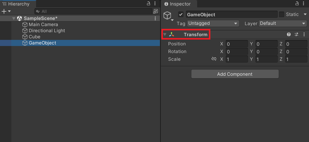 오브젝트가 특정 경로를 따라 이동하는 것을 구현하기 전에, 유니티에 존재하는 이동 방법들에 대해 먼저 알아보자. 우리가 어떤 오브젝트를 생성했을 때 그 오브젝트의 인스펙터창을 보게 되면 다음과 같은 Transform 컴포넌트가 항상 존재한다.