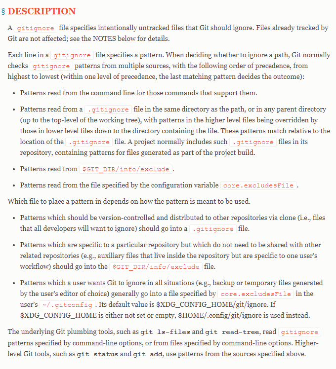 다음은 Git 홈페이지 공식 문서에 있는 gitignore에 대한 설명이다. .gitignore 파일은 Git에게 특정 파일이나 디렉터리를 추적하지 않도록 지시하는 역할을 한다. 주로 빌드 결과물, 로그 파일, 설정 파일 등의 임시 파일이나 개인적인 정보를 포함한 파일, 혹은 라이선스에 민감한 .dll 파일 등을 Git 리포지토리 추적 대상에서 제외하기 위해 사용된다.