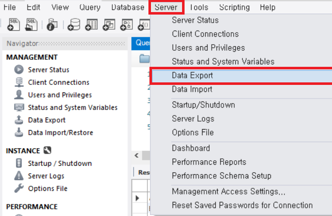사용 중인 플랫폼을 열고, 대상 데이터베이스에 연결한 후 Server 메뉴에서 Data Export를 선택한다.