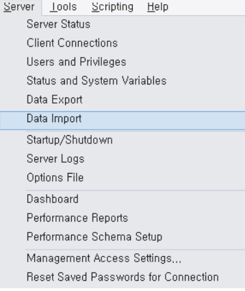 만약 해당 파일을 이용해 데이터를 복원하고 싶다면 Server → Data Import를 선택한다.