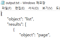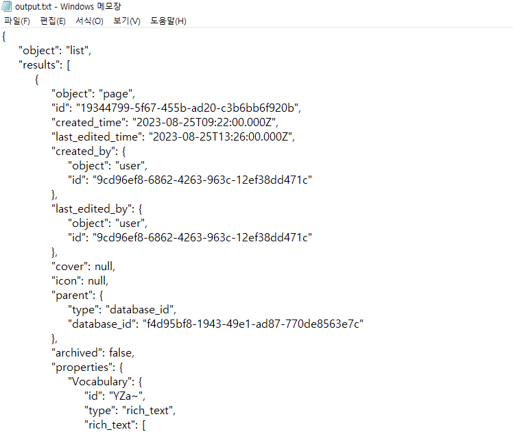 그렇다면 프로그램을 실행하면 Vocabulary 데이터베이스에 있는 단어와 한국어 정의(meaning) 부분의 데이터를 GetNotionAPI.py에서 json 구조로 가져온다. 그리고 해당 파일을 output.txt 형식으로 저장하게 된다.