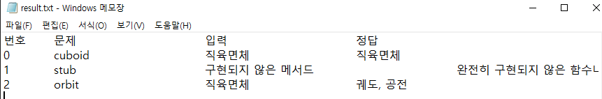 아직 오답, 정답을 처리하는 기능은 따로 구현되지 않아 해당 결과가 result.txt에 저장되고, 해당 파일을 열어서 시험 결과가 어떻게 되었는지 확인한다.