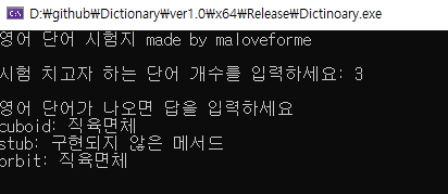 이렇게 저장된 파일을 C++ 에서 ifstream으로 연 후, 모든 내용을 저장한다. 그리고 nlohamnn의 json.hpp 라이브러리를 통해 해당 구조를 읽은 후, 단어들을 배열에 담은 후 시험 문제 출력이 시작된다.