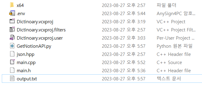 먼저 main.cpp에서 코드를 실행하면, 외부 파이썬 스크립트인 GetNotionAPI.py가 실행된다. 이 스크립트는 노션에서 데이터를 가져와 output.txt 파일에 저장한다. C++ 프로그램은 이 파일을 읽어 단어와 뜻을 파싱하여 사용자에게 문제를 제공한다.