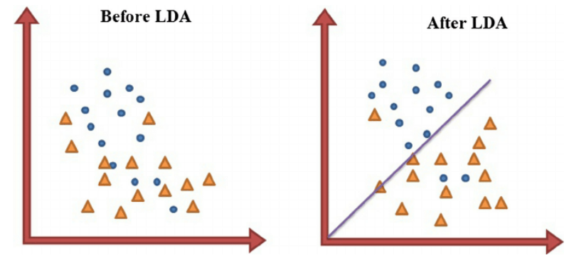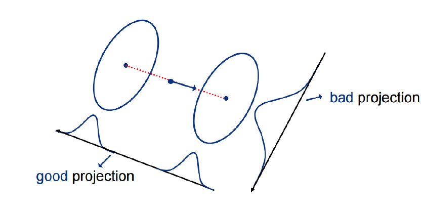 LDA는 데이터의 클래스 레이블을 최대한 유지하면서 차원을 축소하고, 클래스 간의 거리를 최대화하고, 클래스 내의 분산을 최소화하는 방향으로 데이터를 투영한다. 위의 사진에서 bad projection 방향으로 투영하면 데이터가 분류가 되지 않아 나쁜 투영이 되고, good projection 방향으로 투영하면 데이터가 잘 분류되어 좋은 분류가 된다.