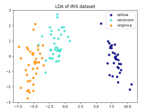 위의 코드는 과정을 자세히 다루기 위해, 관련 라이브러리를 다루지 않아 코드가 길어졌다. 이번엔 scikit-learn에서 제공하는 LDA 클래스를 사용하면 LDA를 쉽게 적용해 볼 수 있다. 아래의 코드는 iris 데이터셋에 LDA를 적용하고, 결과를 2차원 공간에 시각화하는 예제다.