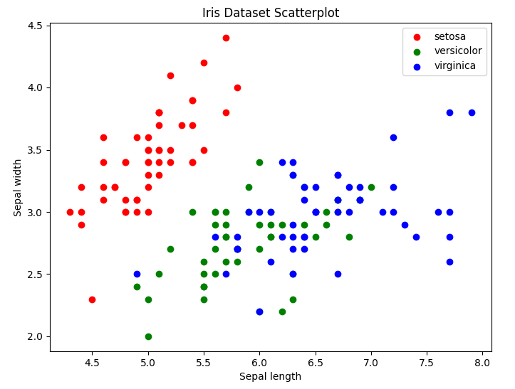 위와 같이 setosa, versicolor, virginica 3개의 클래스가 길이와 높이로 구분되어 있다고 가정해 보자. iris 데이터를 불러와 X값과 y값에 iris의 데이터와 타깃을 초기화한다.