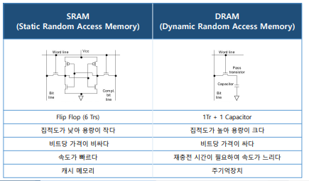 a. SRAM: 플립플롭 회로를 이용해 구성하며, 가격이 비싸지만 속도가 빠름