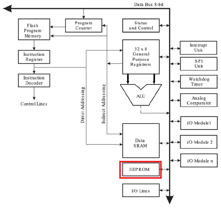또한 데이터 메모리는 32개의 범용 레지스터 영역, 64개의 I/O 레지스터 영역, 160개의 확장 I/O 레지스터 영역(여기까지 레지스터 파일 영역), 내부 SRAM, 외부 SRAM 영역으로 나뉜다.