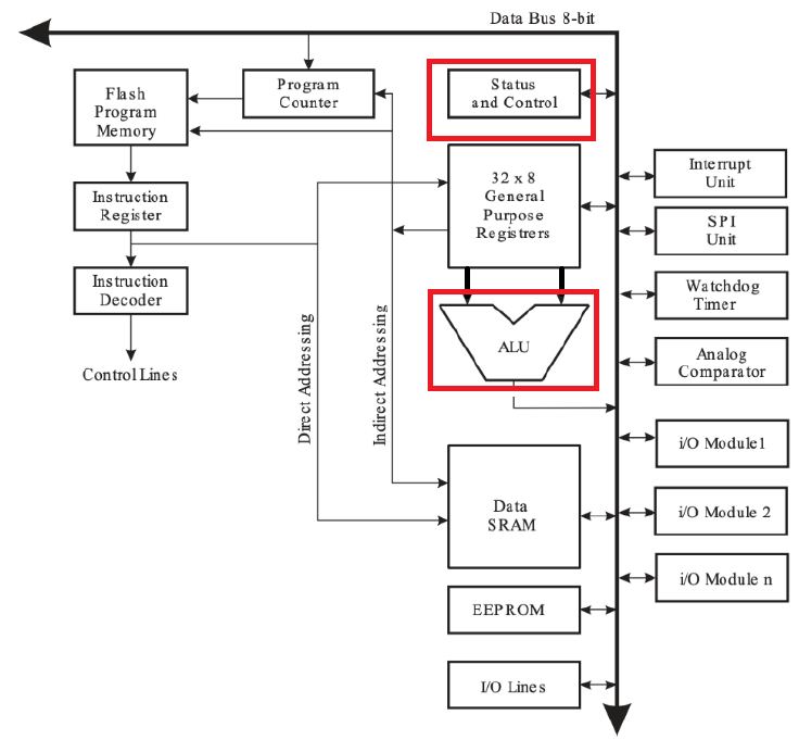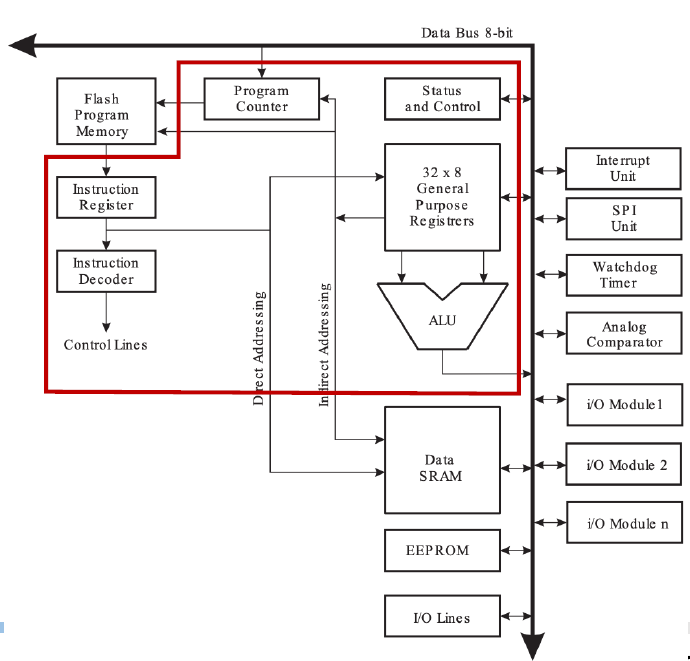 ATmega 128의 CPU 구조다. 여기서 ALU를 포함해 범용 레지스터(General Purpose Register), 상태 제어 레지스터(Status and Control), 프로그램 카운터, 플래시 메모리, 명령 레지스터, 명령 디코더를 코어부라고 한다. 코어는 프로세서의 기본 연산을 수행하는 구성 요소로, 이는 프로그램 명령어를 해석하고 실행하는 데 결정적인 역할을 한다.