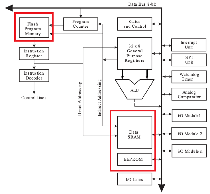 지난 시간에 ATmega 128에 대한 대략적인 개요를 파악했었다. 이번 시간에는 ATmega 128의 CPU와 메모리 구조를 파악해 보는 시간을 가지도록 해보자. 시작하기 앞서 ATmega 128은 프로그램(SRAM)과 데이터(FLASH, EEPROM)가 분리되어 있으므로 Harvard 구조를 채택하고 있다는 점 알아두자. 그리고, 해당 구성요소들은 컴퓨터 구조 시간에서 한 번씩 다뤘던 내용이므로, 헷갈린다면 해당 게시글들을 확인해 보자.